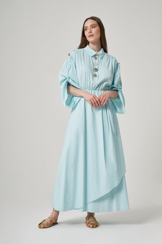 Long Sleeve Maxi Linen Column Regular Aqua Dress