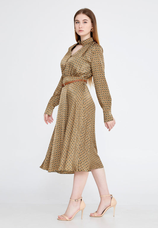 Brown Green Satin Midi Dress
