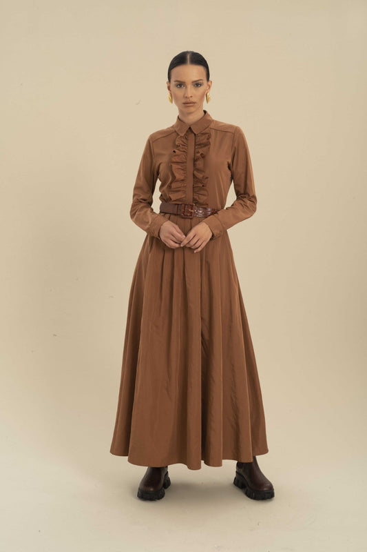 Brown Ruffled Belted Midi Dress