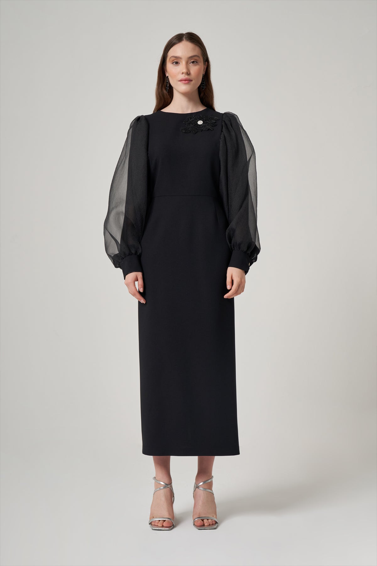 Elevate your style with our Organza Long-Sleeved Black Polyester Dress, a fusion of timeless sophistication and contemporary flair. The dress combines the delicate allure of organza with the sleek elegance of black polyester. Featuring long sleeves for a modest touch, this dress offers a flattering silhouette suitable for various occasions. The rich black hue adds a touch of drama, making it a versatile choice for both formal events and special gatherings. Crafted for comfort and style, this dress seamlessly blends classic charm with modern grace, becoming a wardrobe essential for those who appreciate enduring elegance.